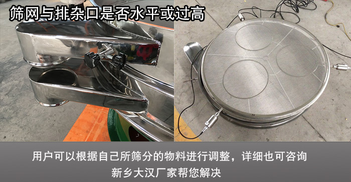 解決方案:通常情況下,超聲波振動篩篩網(wǎng)應比排雜口高出5mm,不同的物料,出料口高度設計不一樣,用戶可以根據(jù)自己所篩分的物料進行調(diào)整,詳細可咨詢新鄉(xiāng)大漢廠家?guī)湍鉀Q。
