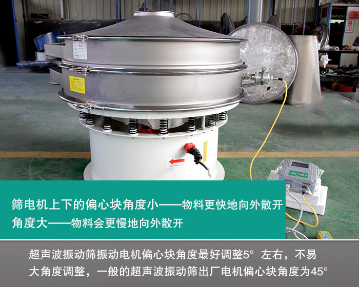 改善出料慢還可以通過調(diào)整超聲波振動篩電機上下偏心塊角度實現(xiàn)。如果超聲波振動篩電機上下的偏心塊角度小,會使篩面上的物料更快地向外散開,角度變大的話,則物料會更慢地向外散開。