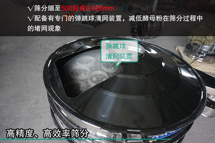 酵母粉屬于食品行業(yè)的一種調(diào)味劑,所以在篩分酵母粉時對其篩分精度要求是很嚴(yán)格的,而三次元振動篩作為一種高精度細(xì)粉篩分設(shè)備,篩分細(xì)至500目或0.028mm,另外三次元振動篩配備有專門的彈跳球清網(wǎng)裝置,減低酵母粉在篩分過程中的堵網(wǎng)現(xiàn)象,提高篩分精度和篩分效率。