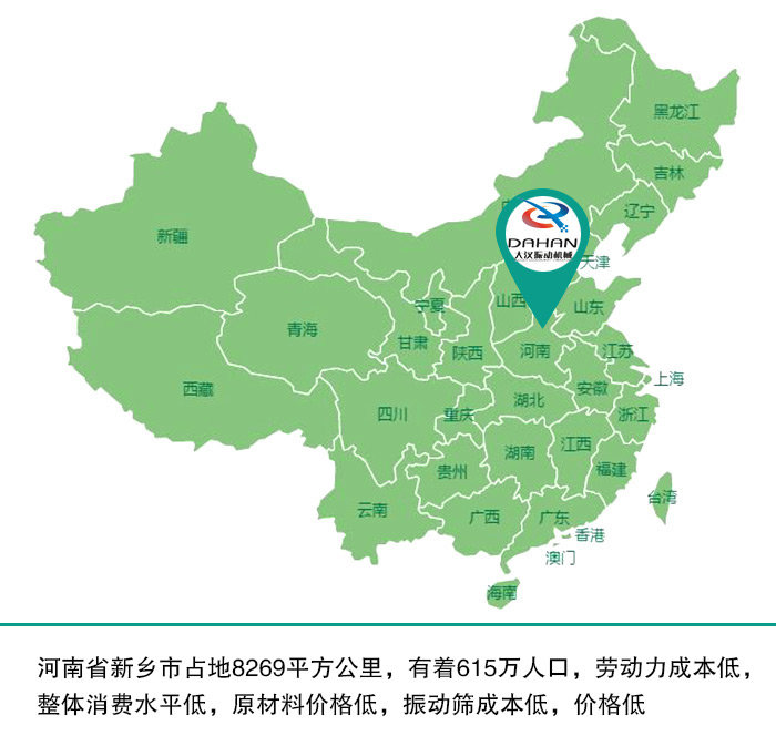 河南省新鄉(xiāng)市占地8269平方公里,有著615萬人口,人口眾多,決定了其勞動(dòng)力成本低,整體消費(fèi)水平低,原材料價(jià)格低,因此決定了振動(dòng)篩成本低,價(jià)格低。
