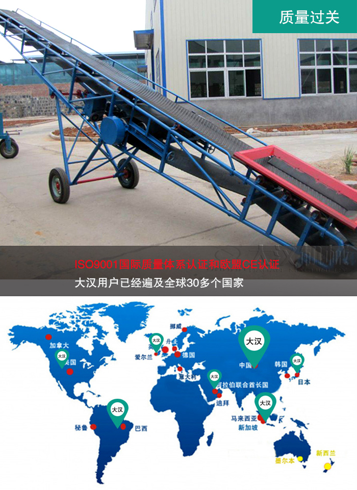 新鄉(xiāng)大漢擁有先進(jìn)生產(chǎn)技術(shù)及焊接工藝,專業(yè)化技術(shù)團(tuán)隊(duì)經(jīng)過(guò)多次對(duì)移動(dòng)式皮帶輸送機(jī)進(jìn)行研究改進(jìn),以完善的檢測(cè)手段和嚴(yán)格的質(zhì)量管理體系打造出品質(zhì)優(yōu)良的設(shè)備,贏得了良好的企業(yè)信譽(yù),大漢移動(dòng)式皮帶輸送機(jī)質(zhì)量通過(guò)ISO9001國(guó)際質(zhì)量體系認(rèn)證和歐盟CE認(rèn)證,大漢用戶已經(jīng)遍及全球30多個(gè)國(guó)家,這是值得您信任的合作商。
