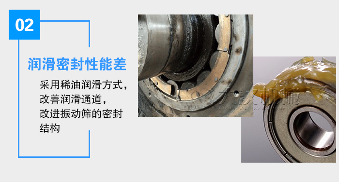 解決方法:采用稀油潤滑方式,改善潤滑通道,改進(jìn)振動(dòng)篩的密封結(jié)構(gòu),當(dāng)前不少振動(dòng)篩廠家采用稀油循環(huán)潤滑,迷宮密封與其他非接觸性密封結(jié)合的結(jié)構(gòu)。