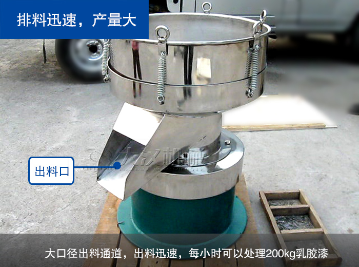 450過濾篩采用大口徑出料通道,出料迅速,每小時(shí)可以處理200kg乳膠漆。