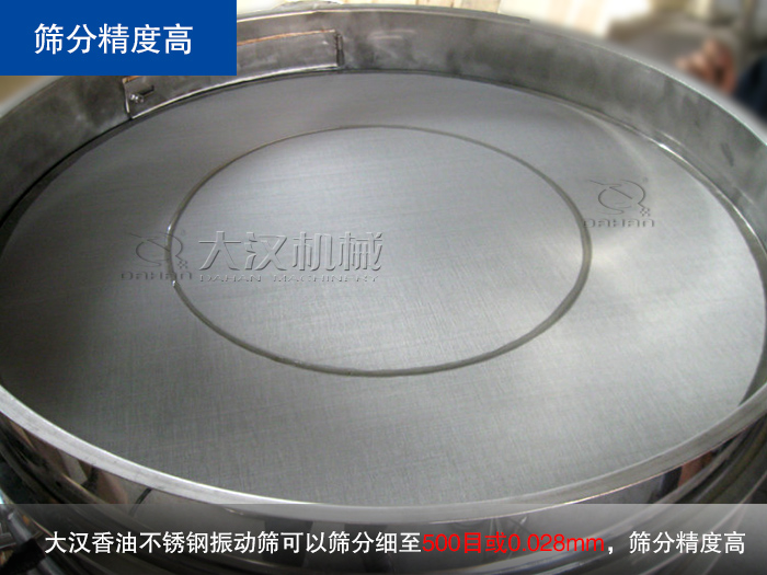香油行業(yè)對于純度,香度是有要求的,這就需要我們的振動篩設備在除雜能力上要更加好,大漢香油不銹鋼振動篩可以篩分細至500目或0.028mm,篩分精度高,適合香油行業(yè)對于高精度的篩分需求。