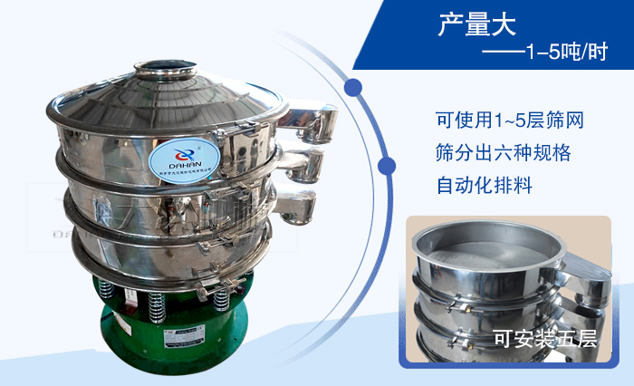 旋振篩可使用1~5層篩網(wǎng),網(wǎng)架經(jīng)過特殊設(shè)計,高可以安裝五層,能篩分出六種規(guī)格不同的物料,可以實現(xiàn)自動化排料,篩分產(chǎn)量范圍在1-5噸/時之間,篩分效果好。
