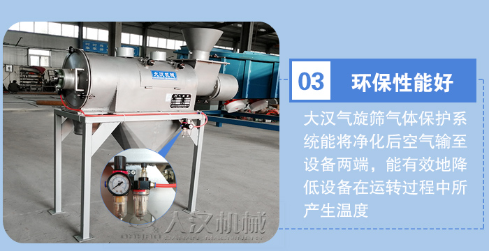 抗氧化劑是一種粉末,所以在篩分途中難免會出現(xiàn)揚(yáng)塵現(xiàn)象,大漢氣旋篩氣體保護(hù)系統(tǒng)能將凈化后空氣輸至設(shè)備兩端,能有效地降低設(shè)備在運(yùn)轉(zhuǎn)過程中所產(chǎn)生溫度,對軸承形成氣體隔離層,從而杜絕粉塵的進(jìn)入和物料的溢散,再加上其密封嚴(yán)謹(jǐn),所以在篩分抗氧化劑過程中粉塵少。