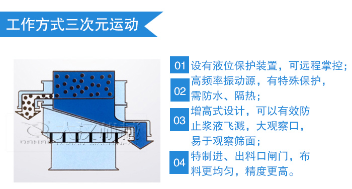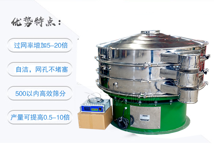 一般為超聲波的振動(dòng)篩,電源產(chǎn)生的高頻電通過(guò)換能器轉(zhuǎn)換成高頻正弦形式的縱向振蕩波,可以有效解決陶瓷粉由于比重輕,高靜電造成的堵網(wǎng)現(xiàn)象。