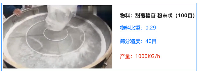 客戶一:物料是甜菊糖苷 粉末狀 物料本身100目左右 物料比重0.29 篩分精度40目 處理量1000KG/h。需要旋振篩。