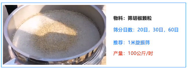 客戶六:自用 篩胡椒顆粒 選的1米旋振篩 機(jī)裝20目,30目,60目 物料流動(dòng)性好 一個(gè)小時(shí)100公斤 20目以上的占5成,60目以下的占3成