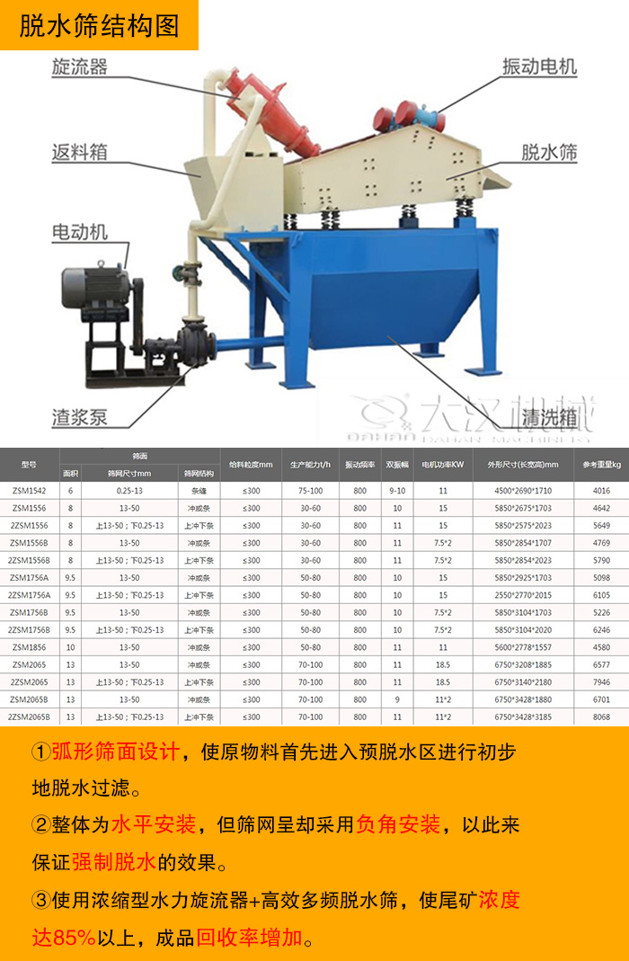 脫水篩篩面多為向上爬坡,有利于尾礦干排,而一般的振動篩是水平或者向下的篩面,更利于出料。脫水篩入料段采用獨特的弧形篩面設(shè)計,使原物料首先進(jìn)入預(yù)脫水區(qū)進(jìn)行初步地脫水過濾,從而大大地提高了脫水效率,然后篩機(jī)部分的整體為水平安裝,但篩網(wǎng)呈卻采用負(fù)角安裝,以此來保證強(qiáng)制脫水的效果。經(jīng)過一步步地脫水過濾,篩分出來的產(chǎn)品更加精細(xì),而且篩機(jī)的處理量高達(dá)70-100t/h,另外,使用濃縮型水力旋流器+高效多頻脫水篩,可以使尾礦終濃度達(dá)85%以上,使成品回收率增加,解決了傳統(tǒng)尾礦排放尾砂造成的環(huán)境污染。