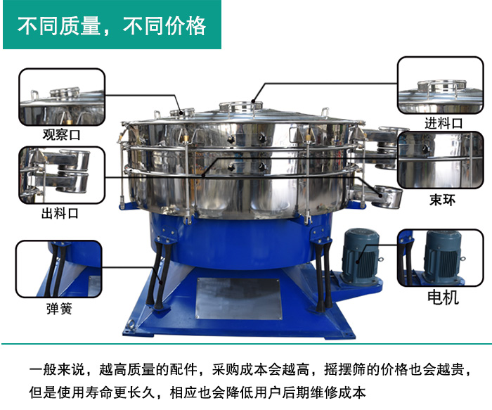 碳鋼材質(zhì)的搖擺篩要比不銹鋼材質(zhì)的搖擺篩便宜,單臺(tái)差價(jià)在1000元左右。