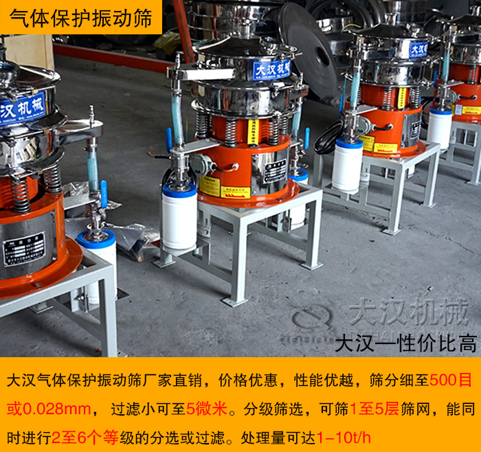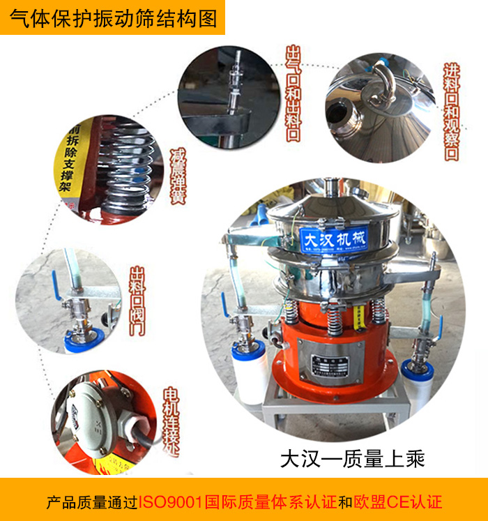 大漢氣體保護(hù)振動(dòng)篩采用304不銹鋼材質(zhì)、氣體保護(hù)軟管、防靜電裝置等制作而成,是振動(dòng)篩和超聲波振動(dòng)篩的一種衍生產(chǎn)品。產(chǎn)品質(zhì)量通過ISO9001國際質(zhì)量體系認(rèn)證歐盟CE認(rèn)證。