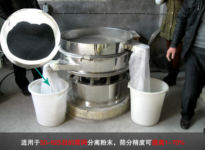石墨粉比重較輕,粒度細(xì)在90到20微米以下,易抱團(tuán),流動(dòng)性較好。普通振動(dòng)篩在篩分過程中會(huì)出現(xiàn)物料團(tuán)聚,漏料的情況,從而造成嚴(yán)重的堵網(wǎng)現(xiàn)象,而超聲波振動(dòng)篩是將220V、50Hz或110V、60Hz電能轉(zhuǎn)化為18KHz的高頻電能,輸入超聲換能器,將其變成18KHz機(jī)械振動(dòng),使篩面上的石墨粉始終保持懸浮狀態(tài),有效解決了堵網(wǎng)問題。