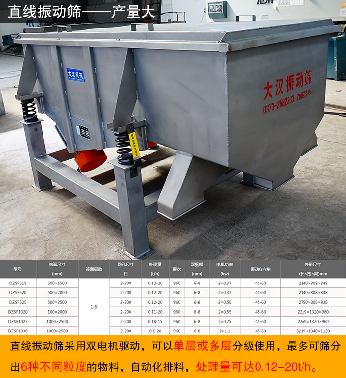 直線振動(dòng)篩采用雙電機(jī)驅(qū)動(dòng),使物料在篩網(wǎng)上被拋起,同時(shí)向前作直線運(yùn)動(dòng),物料從給料機(jī)均勻地進(jìn)入篩分機(jī)的進(jìn)料口,通過(guò)多層篩網(wǎng)產(chǎn)生數(shù)種規(guī)格的篩上物、篩下物、分別從各自的出口排出,無(wú)堵塞現(xiàn)象,對(duì)于粉狀、顆粒狀的物料均可篩選、分級(jí)、除雜,對(duì)于固液混合物體可進(jìn)行粗濾,可以單層或多層分級(jí)使用,多可篩分出6種不同粒度的物料,自動(dòng)化排料,處理量可達(dá)0.12-20t/h。