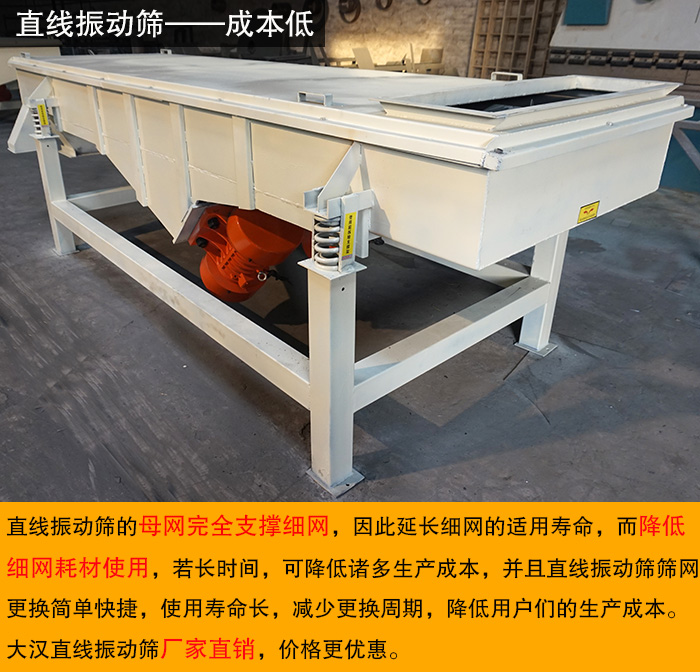 買質(zhì)量好的設(shè)備也要同時(shí)考慮其價(jià)格是否在預(yù)算內(nèi),大漢直線振動(dòng)篩篩分效率高、設(shè)計(jì)精巧耐用。廠家直銷,價(jià)格優(yōu)惠。而且直線振動(dòng)篩的母網(wǎng)完全支撐細(xì)網(wǎng),因此延長(zhǎng)細(xì)網(wǎng)的適用壽命,而降低細(xì)網(wǎng)耗材使用,若長(zhǎng)時(shí)間,可降低諸多生產(chǎn)成本,并且直線振動(dòng)篩篩網(wǎng)更換簡(jiǎn)單快捷,使用壽命長(zhǎng),減少更換周期,降低用戶們的生產(chǎn)成本。