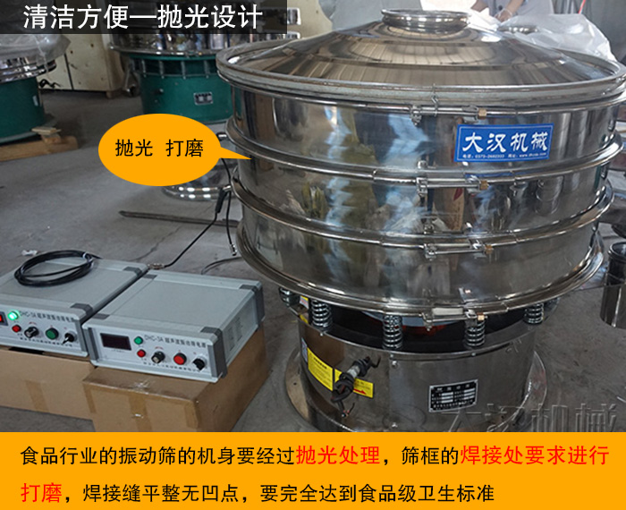 對(duì)于食品行業(yè),由于這些微細(xì)粉末的物料非常容易附著難以清理,所以食品行業(yè)的振動(dòng)篩需要具有清潔方便、無衛(wèi)生死角的特點(diǎn),這就需要食品振動(dòng)篩的機(jī)身要經(jīng)過拋光處理,決不能有倒刺出現(xiàn),因?yàn)閽伖夂蟮恼駝?dòng)篩不容易過沾染這些粉末,而且清洗更方便。篩框的焊接處要求進(jìn)行打磨,焊接縫平整無凹點(diǎn),要完全達(dá)到食品衛(wèi)生標(biāo)準(zhǔn)。
