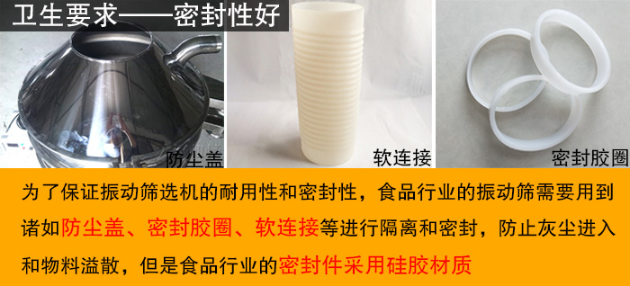 為了保證食品原材料的衛(wèi)生情況,振動(dòng)篩必須有優(yōu)良的密封性,可以避免物料在篩分過程中溢散,浪費(fèi)物料的同時(shí)還對(duì)工作環(huán)境造成污染,影響生產(chǎn)進(jìn)程。為了保證振動(dòng)篩選機(jī)的耐用性和密封性,食品行業(yè)的振動(dòng)篩需要用到諸如防塵蓋、密封膠圈、軟連接等進(jìn)行隔離和密封,防止灰塵進(jìn)入和物料溢散,但是食品行業(yè)的密封件采用硅膠材質(zhì),雖然硅膠材質(zhì)在價(jià)格方面高于橡膠材質(zhì),但是其耐用性、穩(wěn)定性、衛(wèi)生程度是橡膠材質(zhì)遠(yuǎn)遠(yuǎn)比不上的。