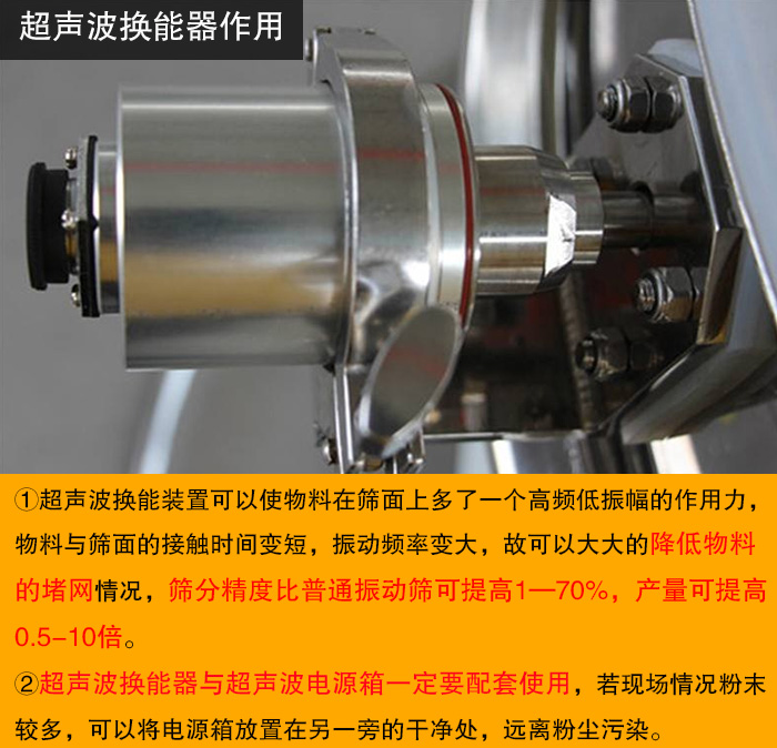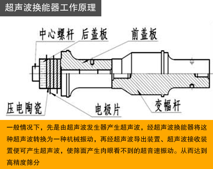超聲波振動(dòng)篩之所以能夠解決強(qiáng)吸附性、易團(tuán)聚、高靜電、高精細(xì)、高密度、輕比重等篩分難題,關(guān)鍵在于超聲波換個(gè)器這一核心配件采得以實(shí)現(xiàn)高精度高效率篩分作業(yè)。那么超聲波換能器到底是什么呢?它又有什么作用呢?