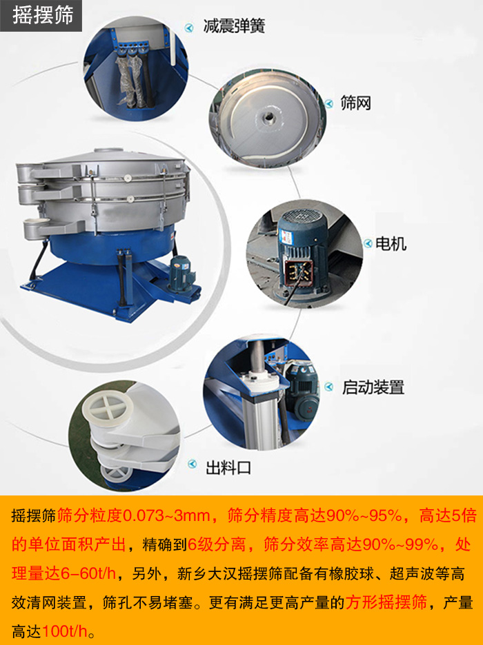 粘性粉狀物料在篩分過程中,由于其具有強(qiáng)的吸附性往往會造成堵網(wǎng)現(xiàn)象,搖擺篩是機(jī)械模擬人工篩分的一種高效篩分機(jī),篩分精度、篩分效率、篩網(wǎng)使用壽命是常規(guī)圓篩的5-10倍,符合所有精細(xì)與超細(xì)范圍的粉末與微粒狀物料,特別適合難以處理的物料。