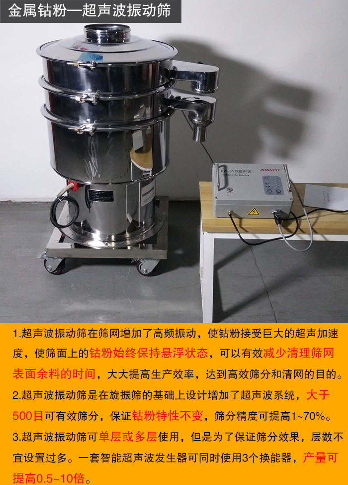 √不堵網(wǎng):在篩網(wǎng)增加了高頻振動,使鈷粉接受巨大的超聲加速度,使篩面上的鈷粉始終保持懸浮狀態(tài),可以有效減少清理篩網(wǎng)表面余料的時間,大大提高生產(chǎn)效率,達(dá)到高效篩分和清網(wǎng)的目的。