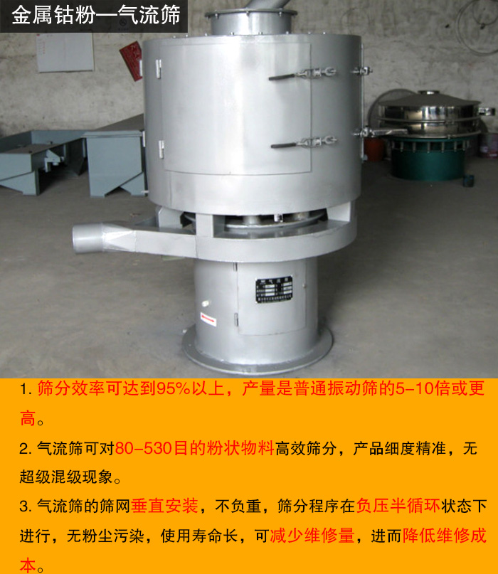 氣流篩篩網(wǎng)為圓筒狀,置于機體內(nèi),作業(yè)時鈷粉不是直接投放到篩體內(nèi),而是經(jīng)由一截螺旋輸送機送入,篩箱內(nèi)的分流葉片高速連續(xù)轉(zhuǎn)動,將送入的鈷粉吹起沖向圓筒狀的篩網(wǎng),細(xì)料透過篩網(wǎng)進(jìn)入成品儲料室,粗料從出料口流出。