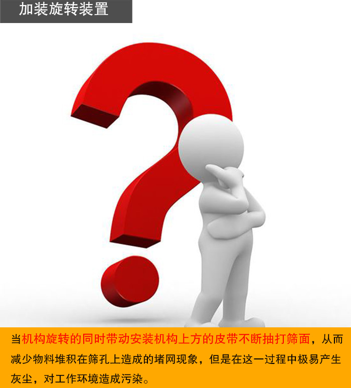 滾筒篩在其固定機架上加裝帶皮帶的旋轉裝置,當機構旋轉的同時帶動安裝機構上方的皮帶不斷抽打篩面,從而減少物料堆積在篩孔上造成的堵網現(xiàn)象,但是在這一過程中極易產生灰塵,對工作環(huán)境造成污染。