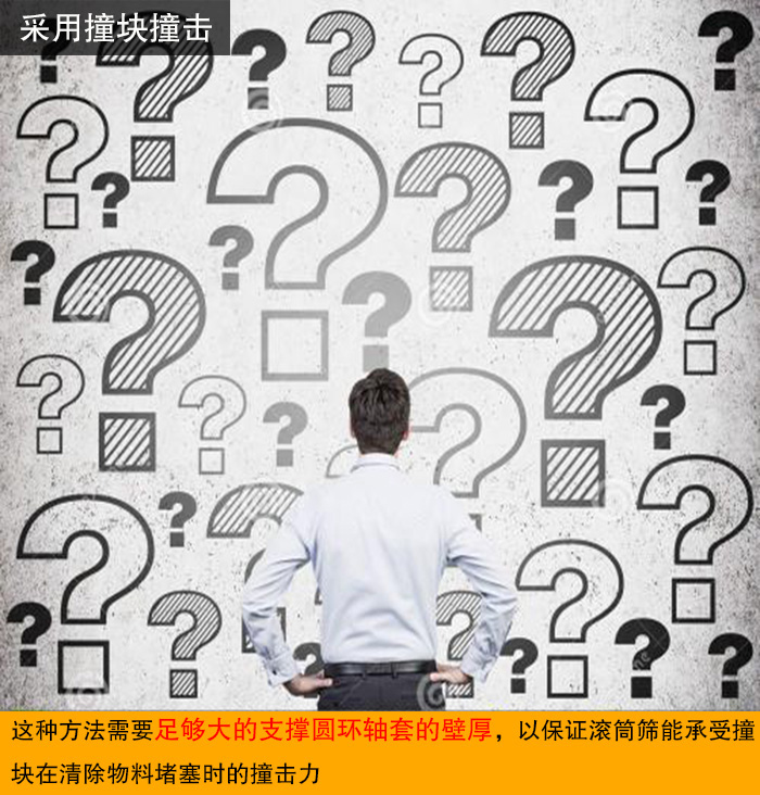 滾筒篩堵網還可以采用撞塊撞擊,但是這種方法需要足夠大的支撐圓環(huán)軸套的壁厚,以保證滾筒篩能承受撞塊在清除物料堵塞時的撞擊力。
