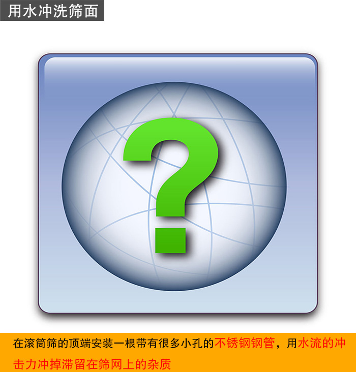 還可以在滾筒篩的頂端安裝一根帶有很多小孔的不銹鋼鋼管,用水流的沖擊力沖掉滯留在篩網上的雜質。