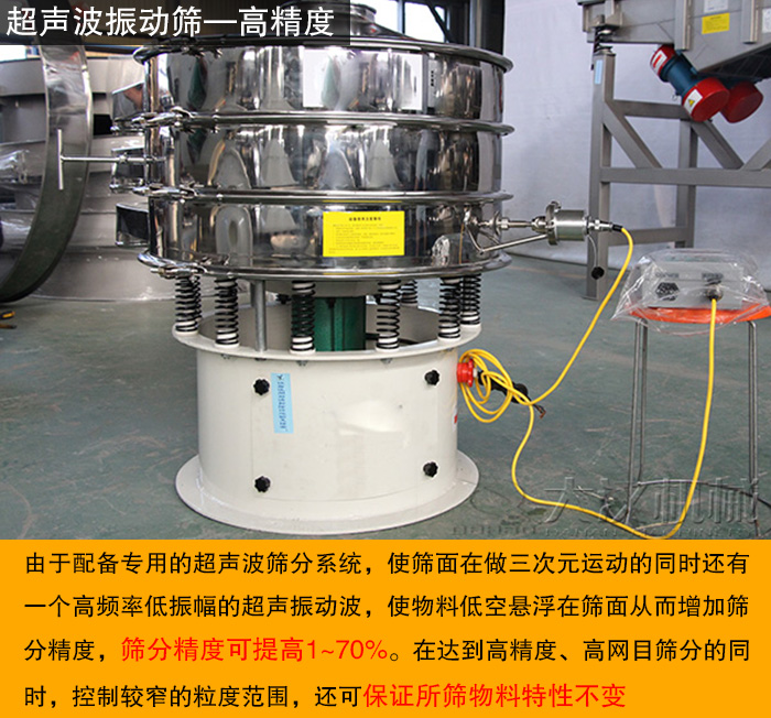 由于配備專用的超聲波篩分系統(tǒng),使篩面在做三次元運動的同時還有一個高頻率低振幅的超聲振動波,使物料低空懸浮在篩面從而增加篩分精度,篩分精度可提高1~70%。在達到高精度、高網(wǎng)目篩分的同時,控制較窄的粒度范圍,還可保證所篩物料特性不變,滿足胡椒粉這種食用調(diào)味品的篩分要求。