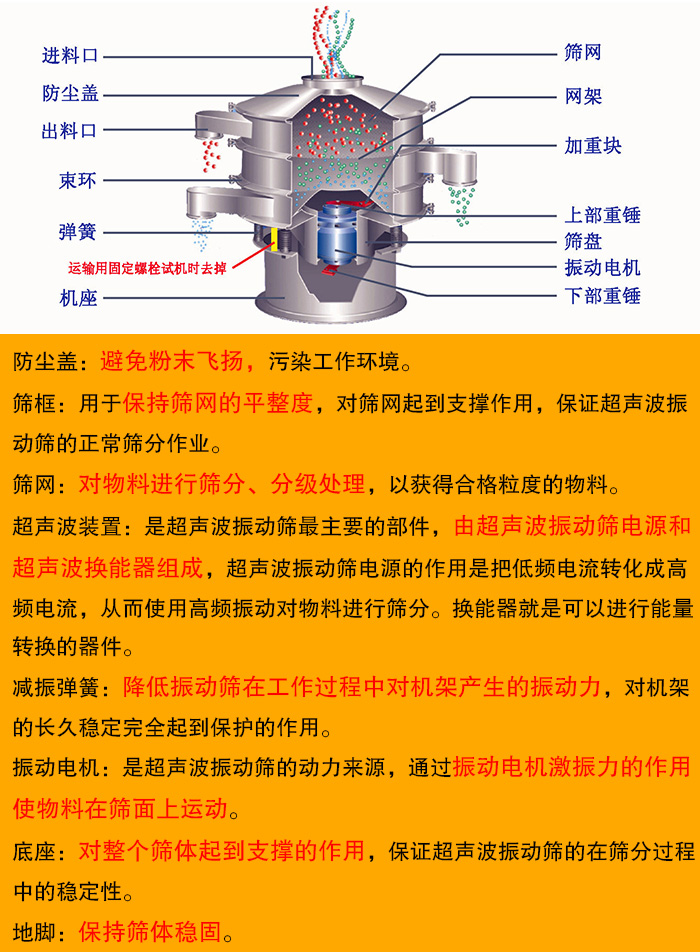 超聲波振動(dòng)篩主要由防塵蓋、篩框、篩網(wǎng)、超聲波裝置、振動(dòng)電機(jī)、減振彈簧、底座、地腳等部分組成。超聲波振動(dòng)篩每個(gè)結(jié)構(gòu)的作用都是非常獨(dú)特的,與篩機(jī)的正常運(yùn)轉(zhuǎn)是密不可分的。下面即是超聲波振動(dòng)篩各個(gè)結(jié)構(gòu)的詳細(xì)介紹: