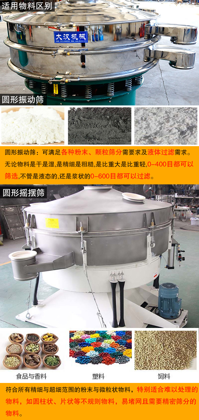 圓形振動篩旋振篩)與圓形搖擺篩都是小型的精細篩分設備,同時從外觀上都是圓形的,篩分五阿貍哦也大多屬于粉末狀,令許多用戶在選購時對這兩者之間的區(qū)別認識較為模糊,以至于無法選擇適合自己的篩分設備,大漢小編將為大家介紹圓形振動篩與圓形搖擺篩的不同之處,并總結如下: