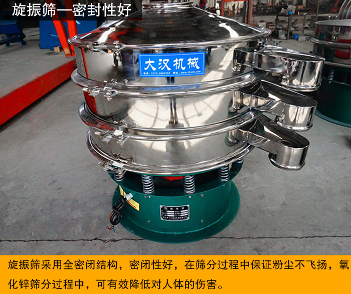 旋振篩密閉性好,在篩分過(guò)程中保證粉塵不飛揚(yáng),氧化鋅篩分過(guò)程中,可有效降低對(duì)人體的傷害。