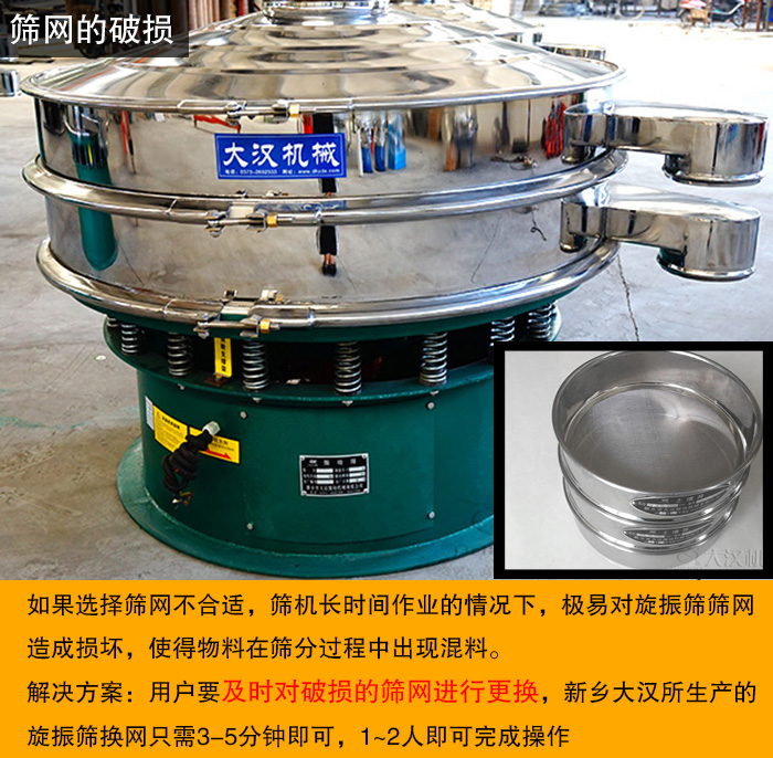 篩網(wǎng)作為直接與物料接觸的部件,主要是對(duì)物料進(jìn)行分級(jí)除雜,然而由于旋振篩用戶篩分物料的不同,對(duì)其篩網(wǎng)的規(guī)格及選材也是不同的,所以如果選擇篩網(wǎng)不合適,篩機(jī)長(zhǎng)時(shí)間作業(yè)的情況下,極易對(duì)旋振篩篩網(wǎng)造成損壞,使得物料在篩分過(guò)程中出現(xiàn)混料。所以用戶要及時(shí)對(duì)破損的篩網(wǎng)進(jìn)行更換,新鄉(xiāng)大漢所生產(chǎn)的旋振篩換網(wǎng)只需3-5分鐘即可,1~2人即可完成操作。
